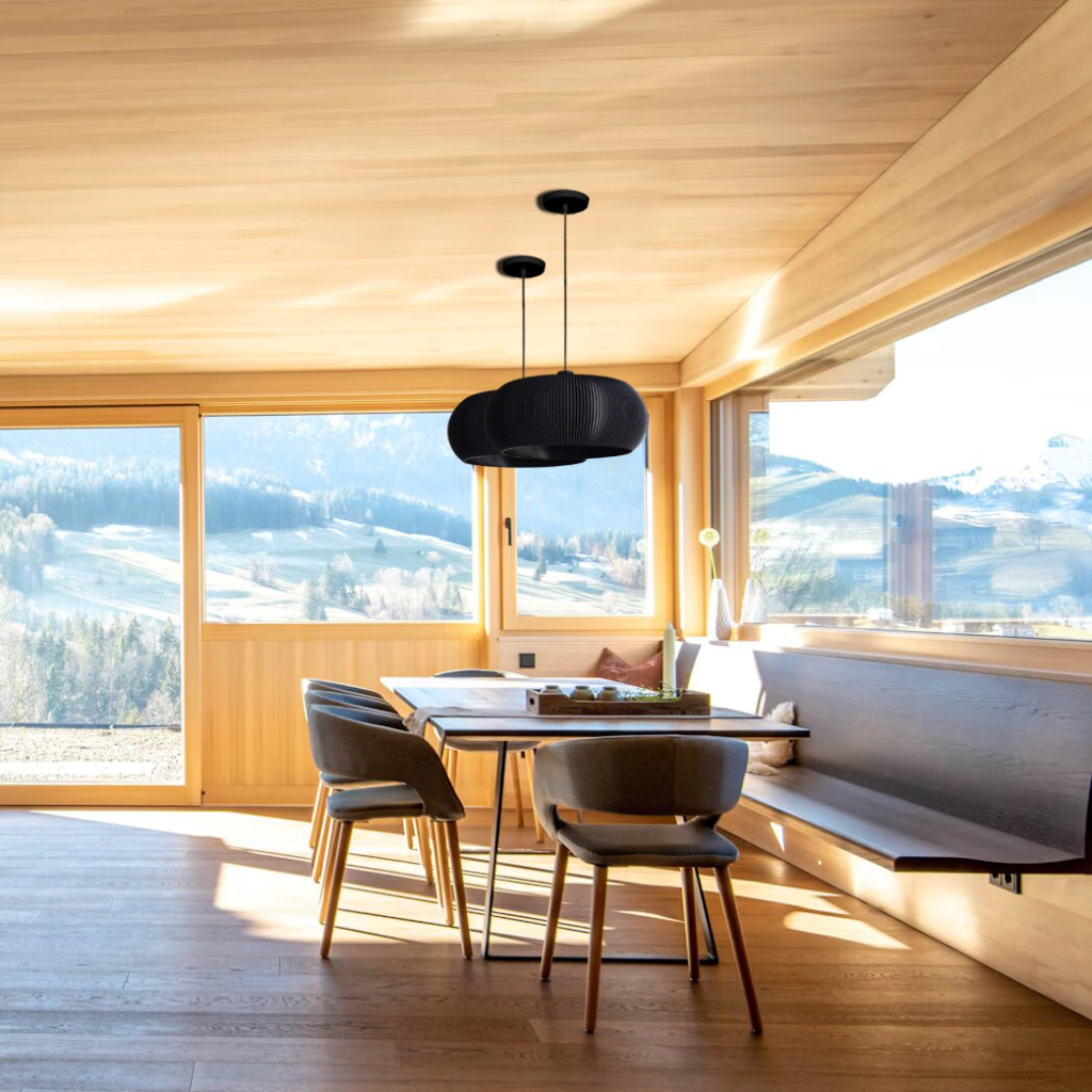 Colores e Iluminación: las lámparas Blancas generan una iluminación general difusa, la luz traspasa las paredes de la tulipa iluminando todo el espacio. Las lámparas Negras generan una iluminación puntual, la luz no traspasa las paredes de la tulipa.
